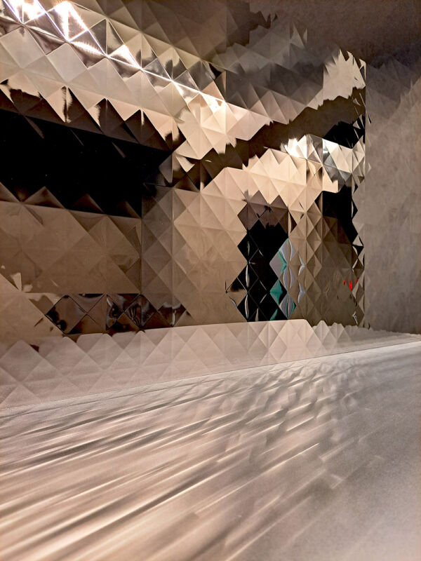 ご採用いただいたのは、「ミステリアスミラー®メタルピラミッド」と名付けられた、ダイヤモンドカットの魔法を宿した三角形の鏡面ステンレス鋼です。この素材は、光と影の織りなす絶妙なバランスを体現し、訪れる者を魅了する美しさを放ちます。