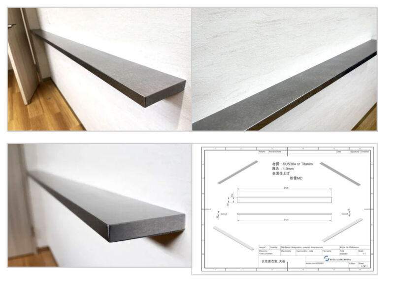 The shelf cover here is made of stainless steel SUS304 powder snow MD. SUS304 powder snow MD is resistant to fingerprints and scratches, making it a durable design metal. In addition, it has been coated with fingerprint and corrosion-resistant glass coating on the surface, significantly improving the design and performance of the metal. These design metals have been attached to the wooden built-in counter using an adhesive method. Furthermore, the corners have been finished with welding and corrective polishing. Welding can be corrected after special polishing.