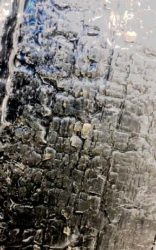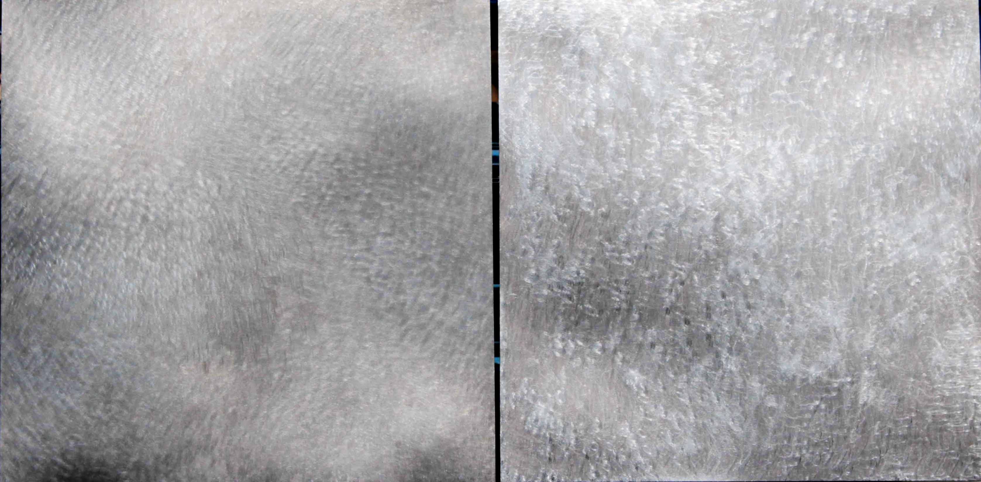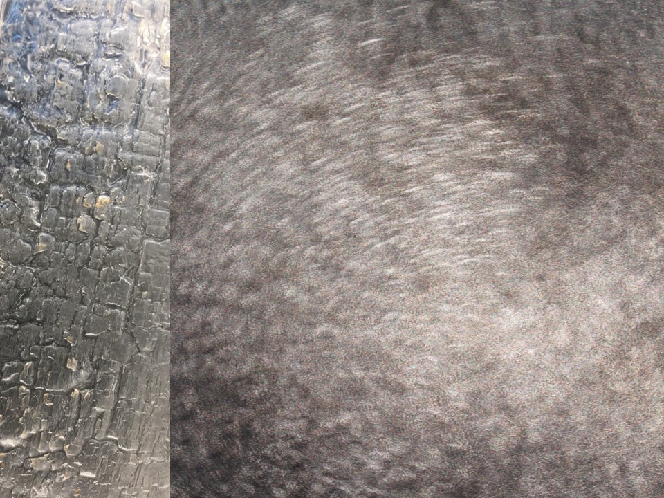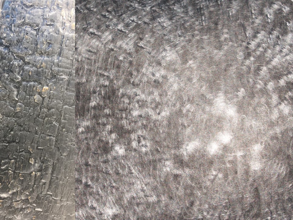 左が写真の焼き杉、右がチタン表面に意匠デザイン研磨加工した焼杉オマージュ(光沢をなくした表現。)