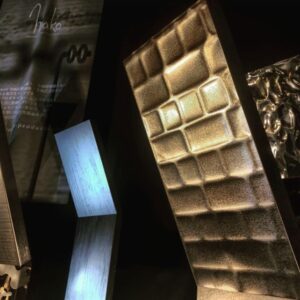 3D水面ステンレスパネルのテクスチャーは今回、水面金属 ripplesとJeux d’eau(ジュ・ドー)を混在させて配置しました。