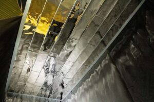 天井材として重要なのは、ライティング用の穴や、通気口、防火関連の機器設置口などですが、3Dステンレスの本体側にあらかじめ穴をあけておき、背面で機器を固定するような構造をとる事で対応が可能です。