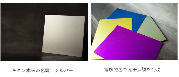 現行のシルバーチタンやゴールデンチタンとの組み合わせで表現できる意匠の例を加工品も含めてご紹介します。まだまだ、素材から発展できていませんが、これからどんどん皆様の意匠イメージを膨らませる提案を行って参ります。