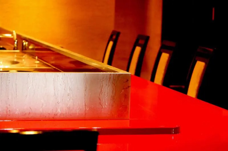高級天ぷら店の内装を手掛けられており、元々全て朱色のカウンターであったところにステンレスを採用いただきました。