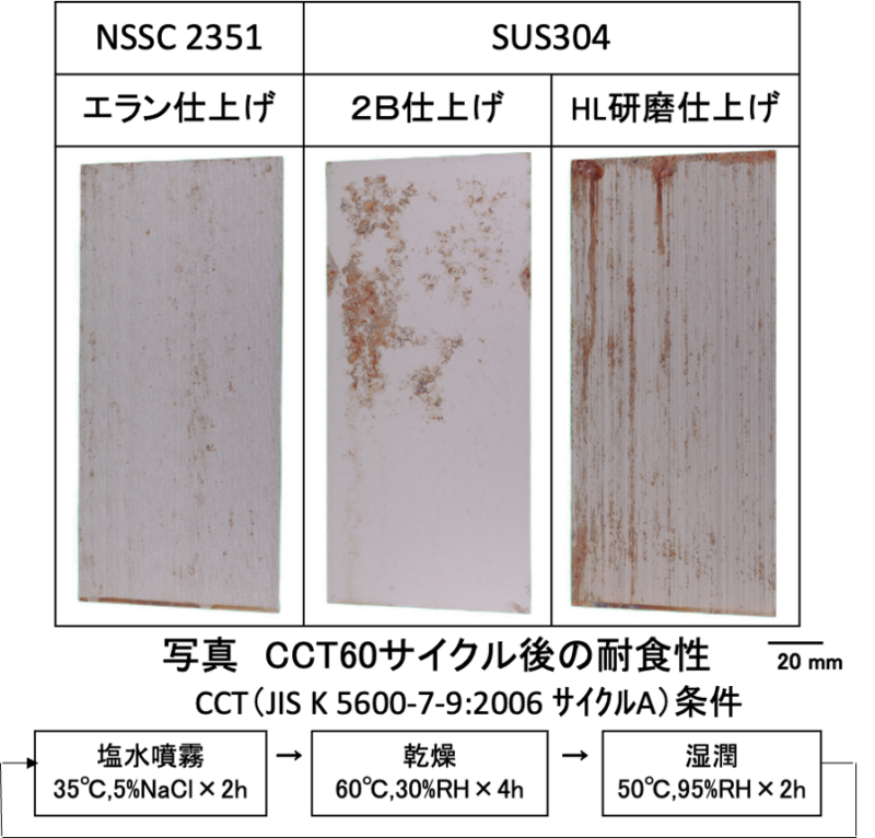 この結果は、一般的なSUS304(2B仕上げやヘアライン)では明確な赤錆が発生した中での評価です。