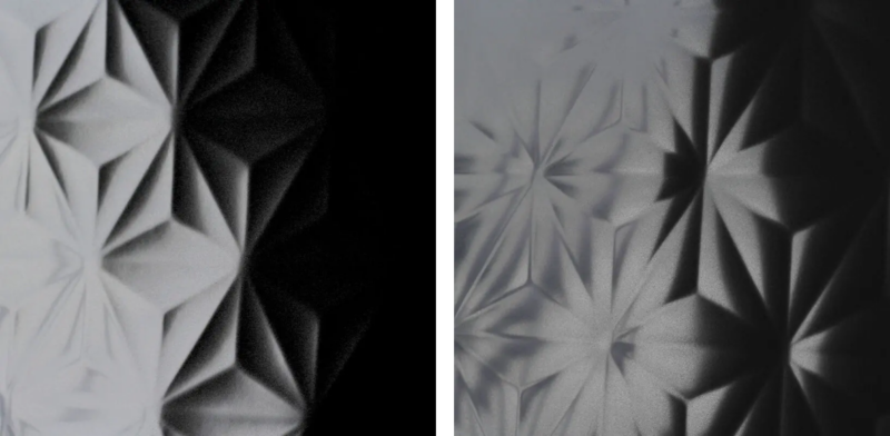 | 見え方 | 均一なパターンの繰り返し。幾何学的で規則的な印象。反射は一様。 | 不規則で有機的な揺らぎ。水面のように光が流れ、視点や光源の変化に応じて表情が変わる。鏡面・半光沢・マットが共存。 |