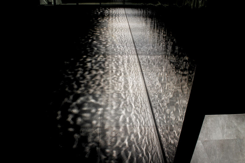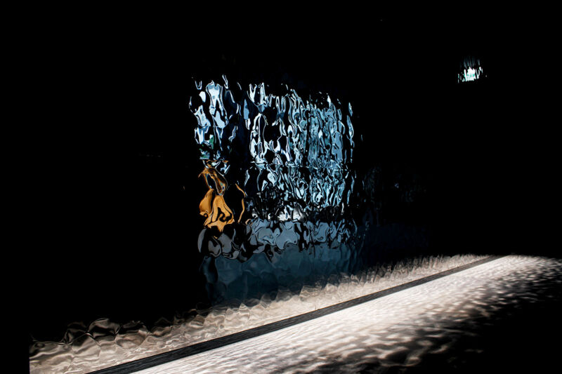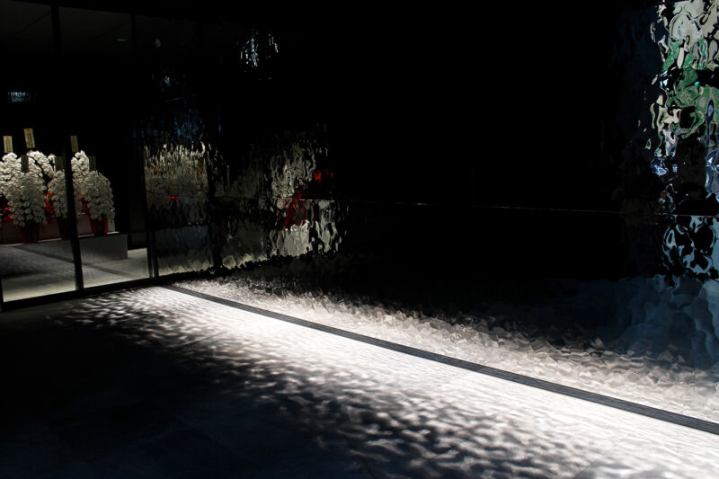 特に、光が巧みに計算された角度で反射し、床面タイルに美しく散りばめられた光が投影される様は、訪れる者を非日常的な世界へ誘います。