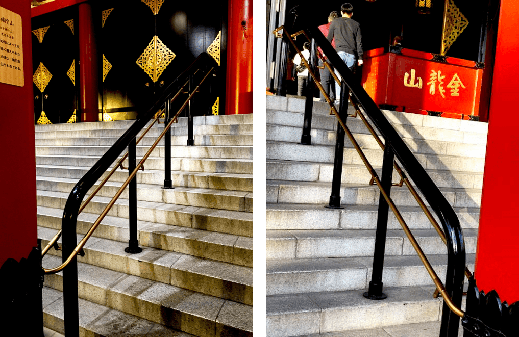 Metal Hyperion pipes are used for the handrail of the stairs in the main hall of Sensoji Temple in Tokyo.