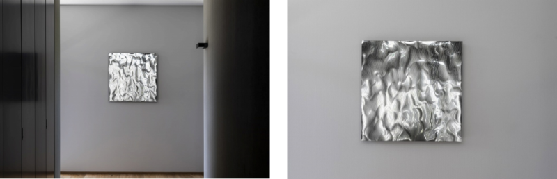The artwork is made of metal, and because of its metallic color, it blends in well with any space.