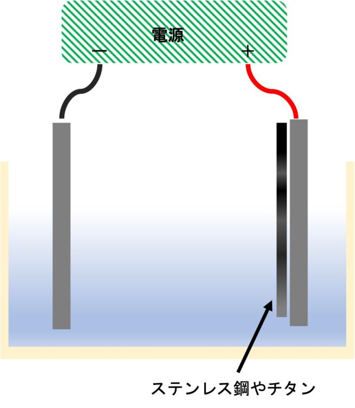 By applying electricity in this way, it is possible to obtain an iridescent surface by the reaction in the electrolyte and the growth of a passive film.
