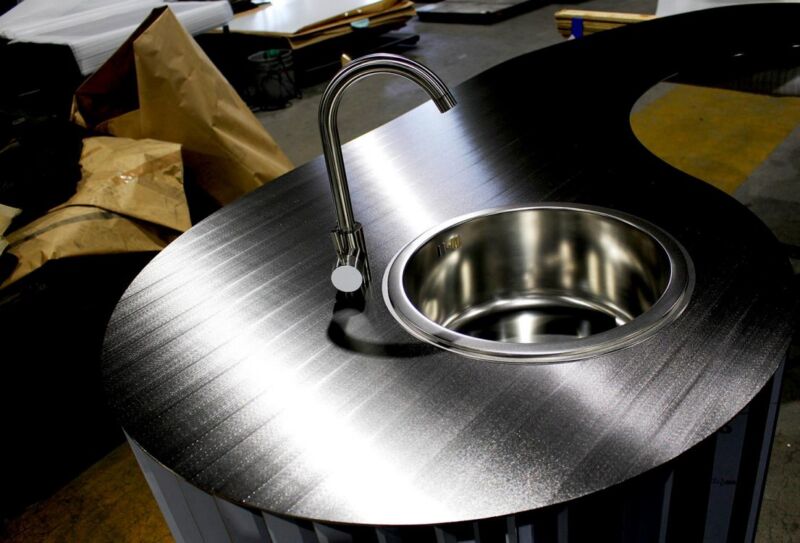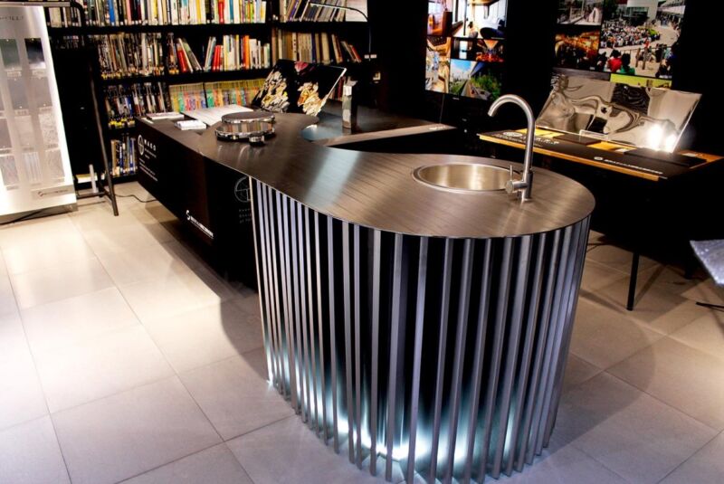 Stainless steel, which can be cut into free curves, offers a new type of top panel design that was not feasible with conventional products. The cut surface (edge) is elegantly finished, giving a sharp, luxurious impression.
