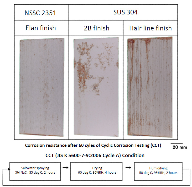 This result was achieved while distinct red rust was formed on standard SUS304 (with 2B finish or hairline finish).