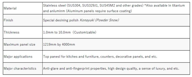 Konayuki (Powder Snow) is a designing metal that imbues stainless steel with serene poetic charm. Its fine polishing pattern gently diffuses light, achieving both elegance and calm. It offers a high-quality, eye-friendly anti-glare finish without the harsh glare of a mirror. It exudes a crisp, clean presence, perfect for high-end kitchens and hotel/restaurant counters.