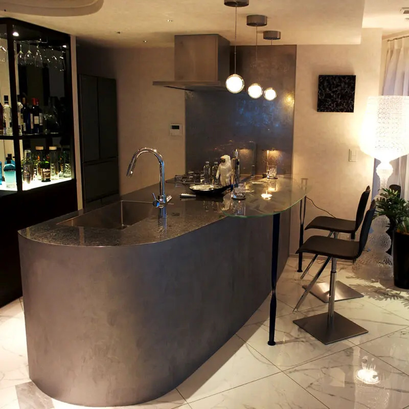 Konayuki (Powder Snow) was adopted for the highly designed kitchen countertop and kitchen panels in a show apartment in Chuo Ward, Tokyo, Japan.