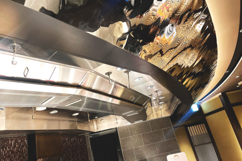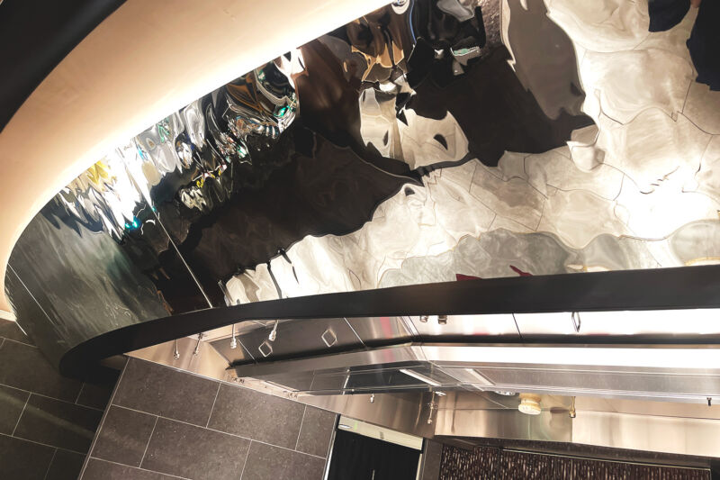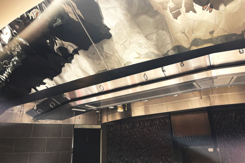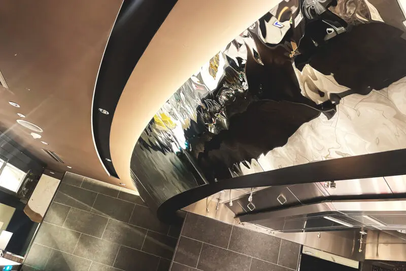 Mysterious stainless steel mirror JUDEAU was installed on a curved surface above a counter.