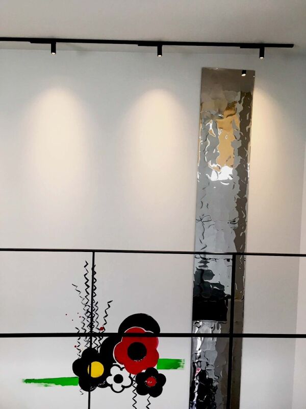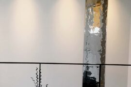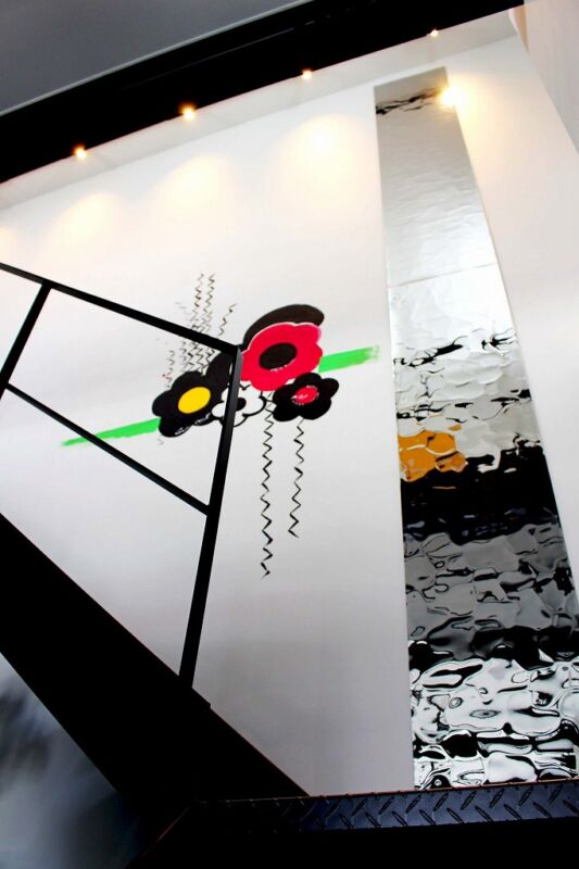 Shokou Yamada designed the Mysterious Stainless Steel Mirror ripples for the wall artwork on the stairs at the head office of Senda Motors Company in Imizu City, Toyama Prefecture.