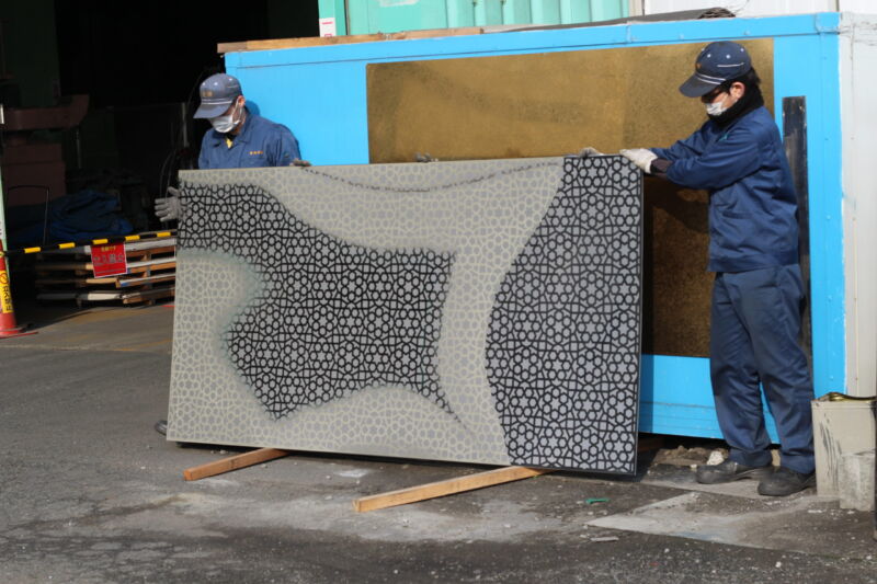 | その他 | 量産性を持つテクスチャー意匠ステンレス鋼板です。 大面積使用を前提とした設計となっています。 柄は連続柄ですので、切断位置を正しく配置すれば模様はつながります。 |